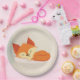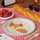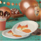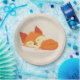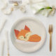 Paper plates with a drawing of an adorable orange fox sleeping peacefully. A light brown background with faint geometric shapes.