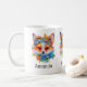 A mug with an illustration of an adorable fox portrait with a blue and orange floral crown and collar.