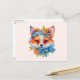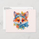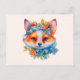 A postcard with an illustration of an adorable fox portrait with a blue and orange floral crown and collar.