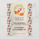 Save the date party postcard with a drawing of a cute fox sleeping peacefully. A green leaves wreath behind. The background is a pattern with pale polka dots and colorful macarons.