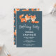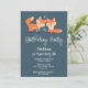 Birthday invitation with a graphic illustration of 2 orange foxes looking cute and happy.