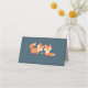 Folded place card with a graphic illustration of 2 orange foxes looking cute and happy. Dark green background.