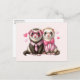 A postcard with a cute illustration. A pair of otters in pink people clothing. Wearing striped shirts and one wearing a tie and the other wearing a bow. Surrounded by love hearts.