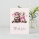 Thank you card with a cute illustration. A pair of otters in pink people clothing. Wearing striped shirts and one wearing a tie and the other wearing a bow. Surrounded by love hearts.