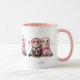A mug with a cute illustration. A pair of otters in pink people clothing. Wearing striped shirts and one wearing a tie and the other wearing a bow. Surrounded by love hearts.