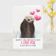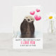 A Valentine's Day greeting card which says: " Happy valentine's day I love you like no otter" with an image of a cute otter with hearts floating upward. The hearts are pink and chubby-looking with a shiny reflection.This otter is quite adorable with his paws resting under his furry little chin. His fur looks wet from hanging out in the water.