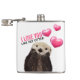 A flask which says: " I love you like no otter" with an image of a cute otter with hearts floating upward. The hearts are pink and chubby-looking with a shiny reflection.This otter is quite adorable with his paws resting under his furry little chin. His fur looks wet from hanging out in the water.