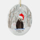 Timeless and cute Christmas ornament featuring an adorable otter with a bright red Santa Claus hat. The watercolor-themed background features a subtle winter snowfall of muted pastels amongst the forest full of trees. Two red hearts accompany the otter. The typography is a classic sans serif print. Personalize with a child's name and the year. Makes a great gift and goes well with other products. Merry Christmas!