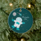 This cute boy's personalized round ceramic ornament has an out of this world space theme! The background has a dark teal color with lots of yellow, white, and grey stars in the background. There is an astronaut on the bottom with a gray moon with a star flag at the top. There is a rocket ship floating to the right of the moon. On the right, you can easily customize the name and the year.