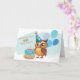Cute birthday card with an owl, wearing a party hat, holding balloons, and standing next to a birthday cake. Teal colors throughout. Inside messaging reads: "Happy Birthday!" Feel free to update this text as you see fit.