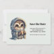 Save the date card with a cute illustration of a cute owl in a winter robe and scarf holding a hot coffee.