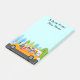 A yellow school bus with an owl bus driver and student passengers. They driving down a street lined with cute whimsical blue and green trees. Personalize this note pad for a bus driver, teacher, educator or school employee.