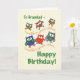A fun birthday card for a Grandad with cute and colorful owls on a parchment-colored background, from a hand-painted paper collage by Judy Adamson. A custom front version of this birthday card is also available in case you want to use it for a different relation or a specific person and you can change the inside message if you wish.
