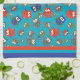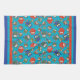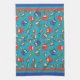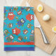 A fun Kitchen Towel or Tea Towel, with a pattern of cute owls in red, blue, green on a turquoise background. The owl pattern was an original handpainted paper collage design by Judy Adamson.