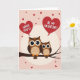 This greeting card shows two cute owls sitting close together on a thin dark branch, with the bigger owl on the left and the smaller one on the right. Both owls have wide, sweet eyes and soft brown feathers, and their lighter chest feathers are patterned with tiny heart shapes. Behind them is a large pale circle that looks like a gentle glow, set against a light pink background. Small red hearts are scattered around the scene, adding a clear Valentine’s Day feel. At the top, two heart-shaped speech bubbles hold the message, one over each owl. The left heart says “WHOO OOO’LL” and the right heart says “BE MY VALENTINE?”, both in white block letters that stand out against the darker heart shapes.