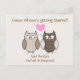 Cute custom wedding Save The Date postcards, with sweet cartoon graphics of two brown and tan polka dot owls, with a pink heart between them. Brown and pink text, on the front and back of the card is ready to personalize to read what you want. Great way to announce your wedding plans early.