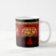 In a square are 2 black Oxen, placed under a golden shape inside of which is the third ox with ideogram. Behind the scene there is a red background on which decorative and ornate letters form the words: OX YEAR. Design on two-tone mug with black background. Matching greeting card, holiday postcard and more... Perfect for Chinese New Year of the Ox or birthday (people born in Ox Year).