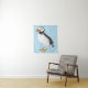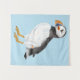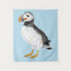 A painted illustration of a puffin. This cute bird is drawn in the style of a children's book illustration. It has stitches and threads on its feathers. A design for anyone who loves puffins.