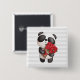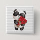A button with an adorable watercolor drawing. An adorable black and white panda bear carrying a bouquet of roses. Gray and white striped background.
