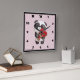 A clock with an adorable watercolor drawing. An adorable black and white panda bear carrying a bouquet of roses.