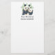 Stationery paperwith a cute watercolor illustration featuring a black and white mom and baby panda bear cuddling together. Mommy is holding her cub amongst some green bamboo stalks.