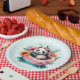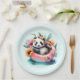Paper plates with an adorable summery image. A watercolor design with a black and white panda sitting in a swimming ring in the water. Surrounded by pretty wildflowers. A totally chill bear.