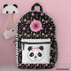 A cute panda bear face with coordinating patterns, including a black and pink floral pattern, black and white stripes and a black and white triangle pattern decorate this adorable girls backpack. Personalize it with your Monogram initial. So fun for back to school, or anytime! Designed for you by Blackberry Boulevard.