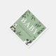 Contemporary but cute baby shower party napkins featureing watercolor deep green botanical foliage leaves framing the text 'BABY' in white text with two playful panda bears on a eucalyptus green background, name and date.