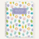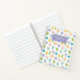 This adorable notebook features a fun pattern of hand drawn monsters in purple, lime green, aqua, gold, orange, and light pink. Great for Back to School and easy to personalize for a great gift! The back contains simple diagonal white stripes over a matching lavender purple.