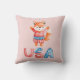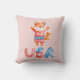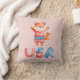 Cute patriotic throw pillow for kids room features watercolor fox dressed in patriotic outfit with stars and stripes "USA"