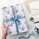 Wrapping paper with a watercolor image of a white fox with fancy blue flora designs all over its fur.