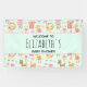 A baby shower banner with a whimsical pattern featuring a collection of delightful children's toys and animals.
