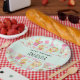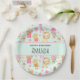 Birthday paper plates with a whimsical pattern featuring a collection of delightful children's toys and animals.