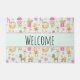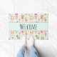 A welcome door mat with a whimsical pattern featuring a collection of delightful children's toys and animals.
