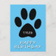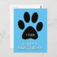Cute Paw Print Blue Happy birthday Postcard. This birthday postcard for children features a black dog paw print on a blue background. Personalize the postcard with your name and you can also change the Happy birthday text.