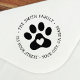 Return address rubber stamp featuring a paw print with a heart inside and your name and address around the paw print in a whimsical style font.