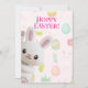The soft pastel background is decorated with colorful Easter eggs, delicate leaves, flowers, and tiny bunny illustrations, creating a cheerful springtime pattern that feels bright, festive, and full of seasonal charm. The combination of gentle colors and cute character design makes this card perfect for both kids and adults
