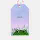 These cute gift tags for frog lovers features an illustrated green frog with large eyes that appears to be partially submerged in a pond at the lower edge of the tag, keeping watch for what may be approaching from the distance, peeking through a few blades of grass under a blue sky that has a pinkish hue - customize with name or your message - part of katz_d_zynes' "Froggy" collection >> https://www.zazzle.com/collections/119251288586496545