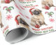 The repeated pattern on this Christmas wrapping paper includes an image of an adorable little Pekingese dog wearing a red Santa hat with a stolen Holiday tree ornament beside him. Red and green text says MERRY CHRISTMAS", and "Happy New Year" with your custom signature below. Other images included in the pattern include red decorative snowflakes and candy canes.