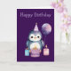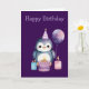 A cute penguin celebrating a birthday with cake and balloons. Suitable for a birthday for anyone