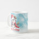 This festive blue and red personalized coffee mug features the "Merry Christmas" saying and the family name template decorated with a cute penguin sitting with a tiny snowman illustration on a snowy blue background.