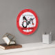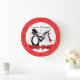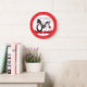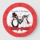 A cute penguin wedding wall clock featuring 2 penguins, the bride penguin is dressed in a white wedding dress with a heart tiara veil carrying a red rose bouquet and the groom penguin with a red bowtie and top hat with a red band surrounded by floating red hearts topped with a red sash and bow!
