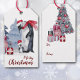 This is a cute Christmas gift tag for kids and adults alike. The front shows a penguin parent wearing a Santa Claus hat and red winter scarf, gazing down at a penguin child who sits at his feet. Behind him are winter pine trees, and beside them is a pile of brightly wrapped gift packages. The red text at the bottom says "Merry Christmas". The back of the tag has a matching image of a decorated Holiday tree and the gift packages, plus your custom text.
