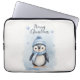 A charming winter illustration of an adorable little penguin wearing a blue striped hat and scarf, bringing a cozy and festive vibe. The soft snowflakes and gentle blue tones in the background create a magical winter atmosphere. Perfect for Christmas cards, posters, stickers, and seasonal crafts!