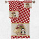 Cute penguin holding candy cane with a retro basket filled with gingerbread and Christmas cookies with red white check bow on top. Cream, gold borders, and red white check background.
