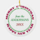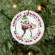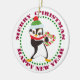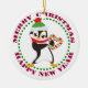 An adorable penguin is dressed in bright red and green hat and scarf on this pretty Holiday ornament. He is holding a red and green striped candy cane heart. The image is surrounded by a green dotted circular frame and the circular text in red Merry Christmas Happy New Year. The image and text are placed on a white background.The back of the ornament has the same red and green circular frame around your custom text.