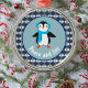 This charming penguin is wearing a scarf and earmuffs for a festive, wintry look. It's surrounded with a plaid-like argyle pattern, similar to the patterns found in some fancy socks.