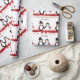 A cute penguin wedding wrapping paper featuring 2 penguins, the bride penguin is dressed in a white wedding dress with a heart tiara veil carrying a red rose bouquet and the groom penguin with a red bowtie and top hat with a red band surrounded by floating red hearts topped with a red sash and bow!