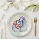 Paper plates with an adorable illustration of a penguin couple cuddling together. Wearing winter scarves and hats. Set on a cream colored vintage background with turquoise accents along the edges