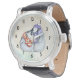 A watch with an adorable illustration of a penguin couple cuddling together. Wearing winter scarves and hats. Set on a cream colored background.